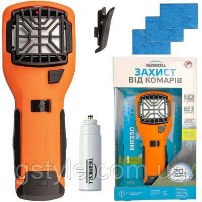 Устройство от комаров Thermacell Portable Mosquito Repeller MR-350 — вдосконалена модель (порівнюючи з MR-300), що дає змогу комфортно перебувати на природі та не турбуватися про те, що комахи завадять робити улюблену справу. Для його роботи необхідно встановити газовий картридж, що фіксується в ручці та пластину з репелентом. Після натискання кнопки пристрій миттєво почне діяти й уже за кілька хвилин утворюється своєрідний щит, що не пропускає комах. Відлякувач створює надійний захист від москітів на площі до 20 кв. метрів (на відстані до 5 метрів). Під час роботи не виділяється ні запаху та жодної рідини, тому його використання абсолютно безпечне та чисте.
